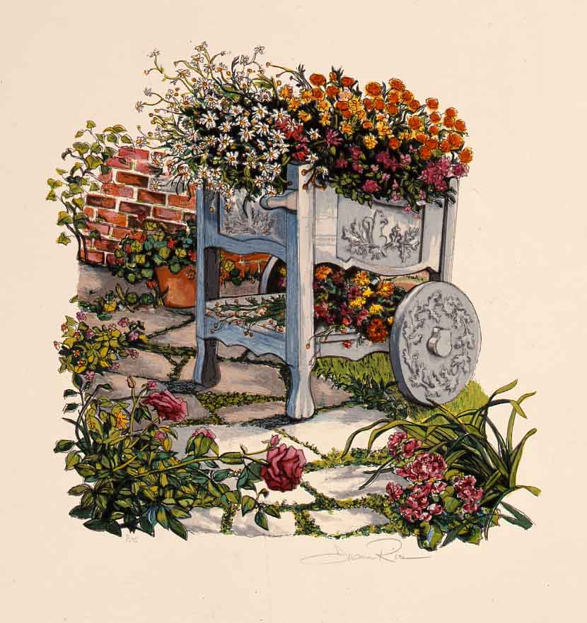 "The Side Garden" is a serigraph created by Susan Rios. The image size is 11.5" x 11" -inch. The artwork ships framed, signed and with a certificate of authenticity.