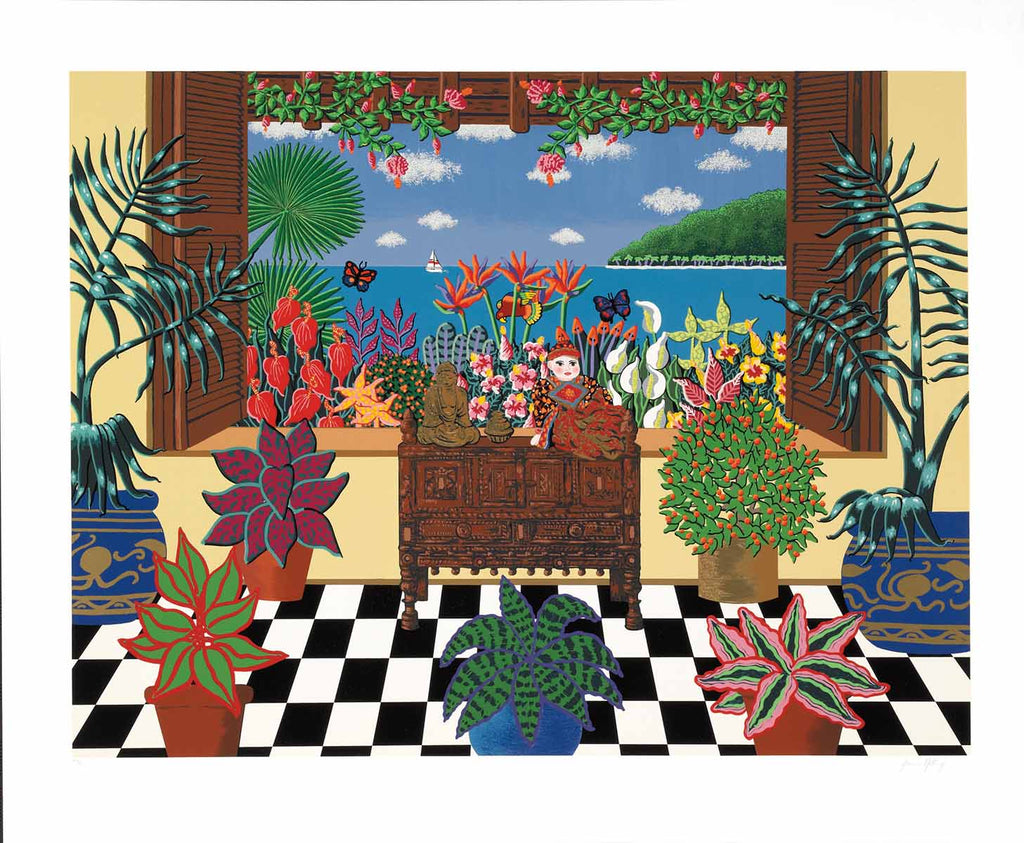 "Tropical Conservatory" is a serigraph created by Joanne Netting. The image size is 24 x 32 - inch. The artwork ships framed, signed and with a certificate of authenticity.