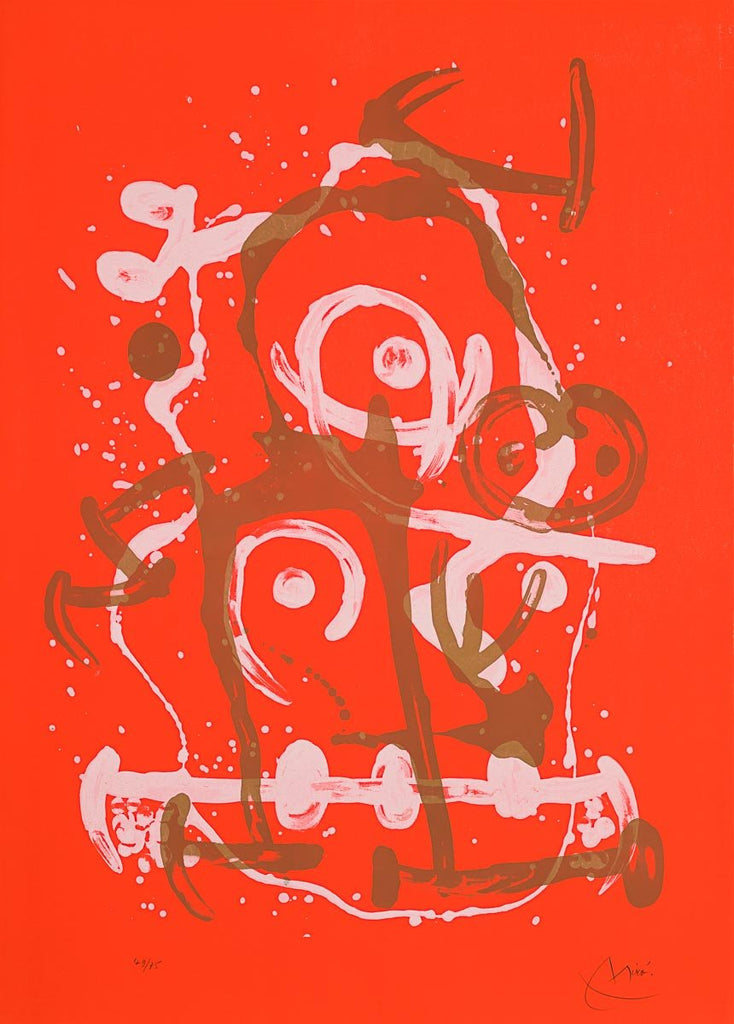 "Chevauchée - Rouge et Brun (M.541)" is a lithograph created by Joan Miró in 1969. From the edition of 75, the artwork is signed 'Miró' lower right and annotated lower left. The image size is 33.25 x 23.75". The artwork ships framed and is accompanied by a certificate of authenticity.