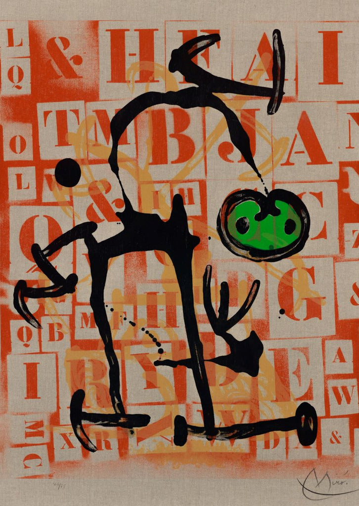 Joan Miró is regarded as one of the most original artists of the 20th century, who often worked with a limited palette, yet the colors he used were bold and expressive. His mature style evolved from the tension between his fanciful, poetic impulse and his vision of the harshness of modern life. Miró worked extensively in lithography and produced many murals, tapestries, and sculptures for public spaces. Despite his fame, he continued to devote himself exclusively to looking and creating. Joan Miró was born in Barcelona, Spain on April 20, 1893. His father was an artisan watchmaker and goldsmith. Based on his parents’ wishes, Miró attended a commercial college, then found work as a clerk in an office for a short period of time. Unfulfilled by his profession, Miró asked for his parent’s permission to allow him to attend art school in Barcelona in 1912. There, he gained great experience learning under Francisco Galí.