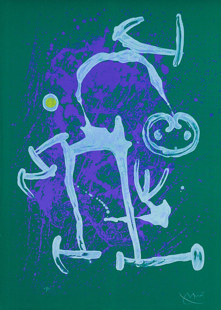 Joan Miró is regarded as one of the most original artists of the 20th century, who often worked with a limited palette, yet the colors he used were bold and expressive. His mature style evolved from the tension between his fanciful, poetic impulse and his vision of the harshness of modern life. Miró worked extensively in lithography and produced many murals, tapestries, and sculptures for public spaces. Despite his fame, he continued to devote himself exclusively to looking and creating. Joan Miró was born in Barcelona, Spain on April 20, 1893. His father was an artisan watchmaker and goldsmith. Based on his parents’ wishes, Miró attended a commercial college, then found work as a clerk in an office for a short period of time. Unfulfilled by his profession, Miró asked for his parent’s permission to allow him to attend art school in Barcelona in 1912. There, he gained great experience learning under Francisco Galí.