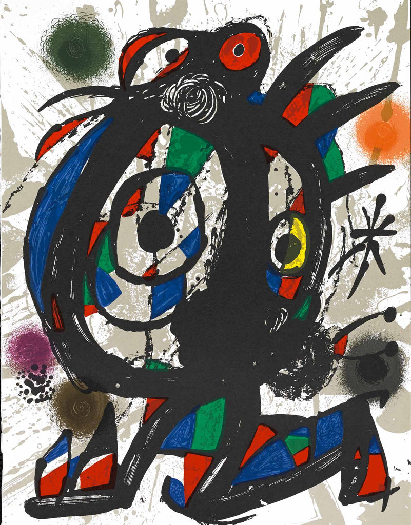 Joan Miró is regarded as one of the most original artists of the 20th century, who often worked with a limited palette, yet the colors he used were bold and expressive. His mature style evolved from the tension between his fanciful, poetic impulse and his vision of the harshness of modern life. Miró worked extensively in lithography and produced many murals, tapestries, and sculptures for public spaces. Despite his fame, he continued to devote himself exclusively to looking and creating. Joan Miró was born in Barcelona, Spain on April 20, 1893. His father was an artisan watchmaker and goldsmith. Based on his parents’ wishes, Miró attended a commercial college, then found work as a clerk in an office for a short period of time. Unfulfilled by his profession, Miró asked for his parent’s permission to allow him to attend art school in Barcelona in 1912. There, he gained great experience learning under Francisco Galí.