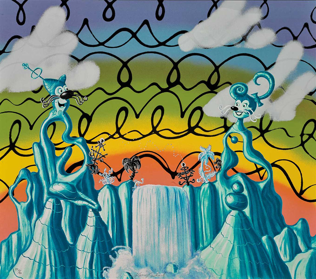 "Aqua Pollination" is a unique trial-proof serigraph created by Kenny Scharf. The image size is 34" x 39" -inch. The artwork ships framed, signed and with a certificate of authenticity.