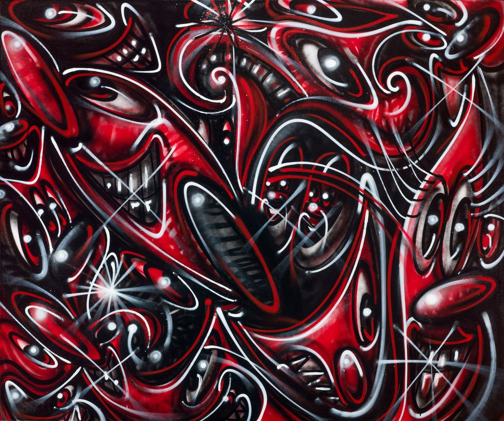 "Blud 'n Tar" is a spray paint on canvas painting created by Kenny Scharf in 2024. The artwork is signed, titled and dated 'Blud 'n Tar Kenny Scharf '24' on verso. The canvas size is 60 x 72" and the artwork is framed in the artists black frame. The artwork ships framed.