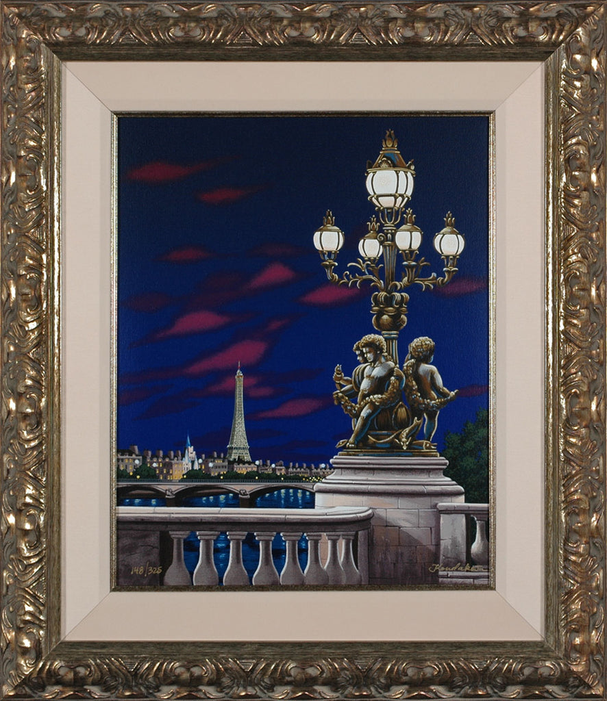 "Pont Alexandre" is a serigraph on linen created by Liudmila Kondakova in 2003 for her 'Postcards from Paris' series. From the edition of 356, the artwork is signed 'Kondakova' lower right and annotated lower left. The canvas size is 18 x 14" and the artwork is framed in an ornate, gold-tone frame. The artwork ships framed and accompanied by a certificate of authenticity.