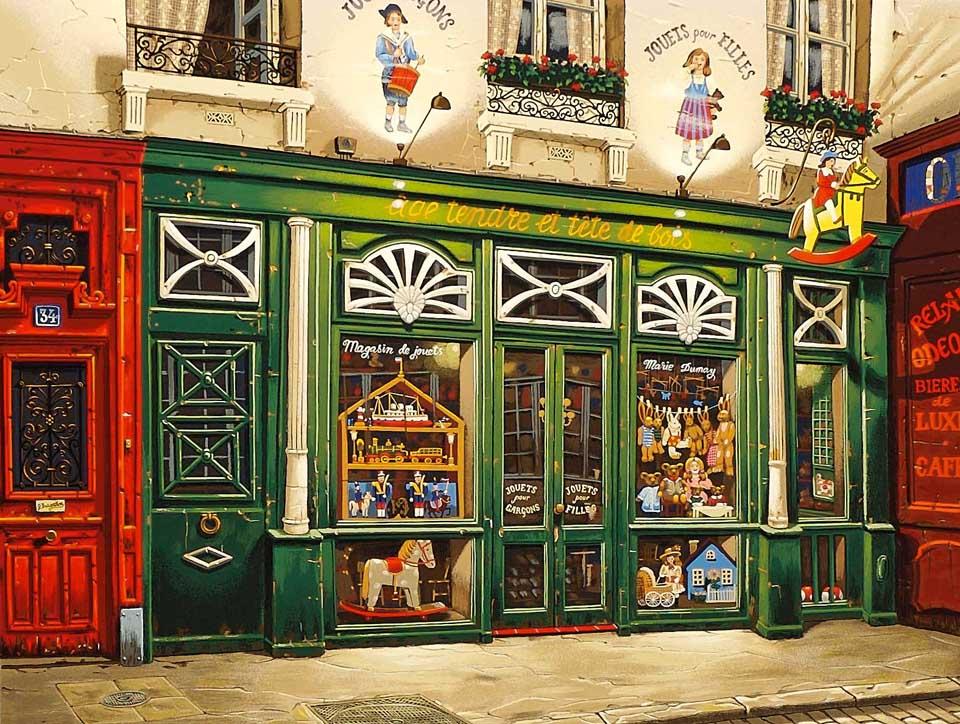 "Toy Store" is a serigraph on paper created by Liudmila Kondakova for her 1998 suite 'Sidewalks of Paris'. From the edition of 325 on white paper, the edition also included 100 on black paper and 100 on canvas for a total edition size of 525. The artwork is signed 'Kondakova' lower right and annotated lower left. The image size is 18 x 24" and the artwork is framed in a contemporary mahogany-syle frame. The artwork ships framed and accompanied by a certificate of authenticity.