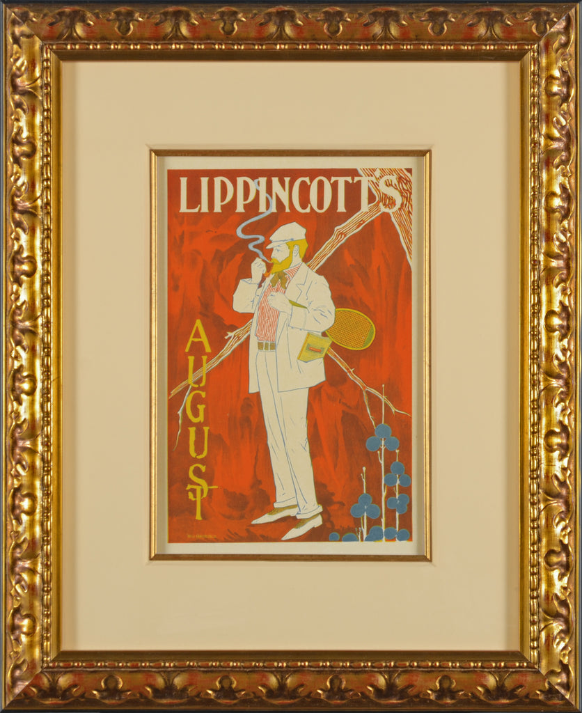 “Lippincott’s (Plate 132)” was created by William Carqueville was an American illustrator and printmaker. Although he studied in Paris for a brief time, Will Carqueville lived in Chicago for most of his life. He founded his own lithographic press there and designed posters for Lippencott's as well as other American literary magazines. His style was somewhat influenced by another American poster artist, Edward Penfield. In the United States, as in Europe at this time, literary magazines flourished and several-Harper's, Lippincott's, Scribner's, and The Atlantic Monthly in particular-helped to popularize the current style of poster design, associating it with the cultural tastes of the day. “Lippincott's (Plate 132)” is a 13 x 9 – inch original stone lithograph created in 1898.