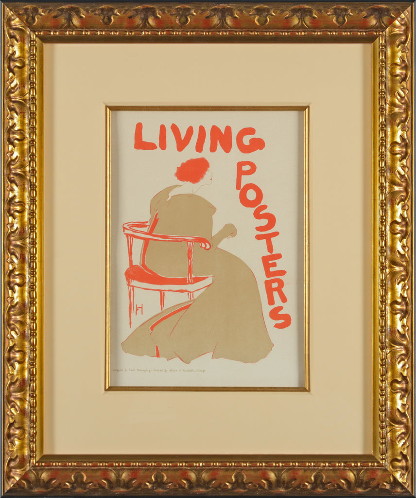 “Living Posters (Plate 87)” was created by Frank Hazenplug was a leading American Art Nouveau artist and designer. Frank Hazenplug worked alongside Will Bradley as a staff artist for the Chicago publisher, Stone & Kimball. He designed around ten posters there (including Living Posters) and also contributed to that most important journal of American Art Nouveau, The Chap Book. Living Posters was originally commissioned as a placard for a Chicago fundraising event. “Living Posters (Plate 87)” is an original lithograph in colors. This antique lithograph is created on fine woven heavy stock paper. Image size: 13 x 9 inches. Paper size: 15.75 x 11.25 – inches. Edition size unknown but speculated around 1025.