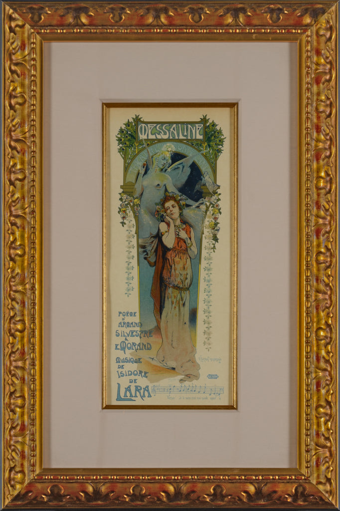 “Mesalina (Plate 187)” was created by V. Lorant – Heilbronn and V. Guillet. This poster announces the opera “Messaline” at the Monte Carlo Theatre. The small text of the music at the bottom right reads ‘Venus! I feel it, is I that she is calling”. “Mesalina (Plate 187)” is a 14.25 x 6 – inch original stone lithograph created in 1899.