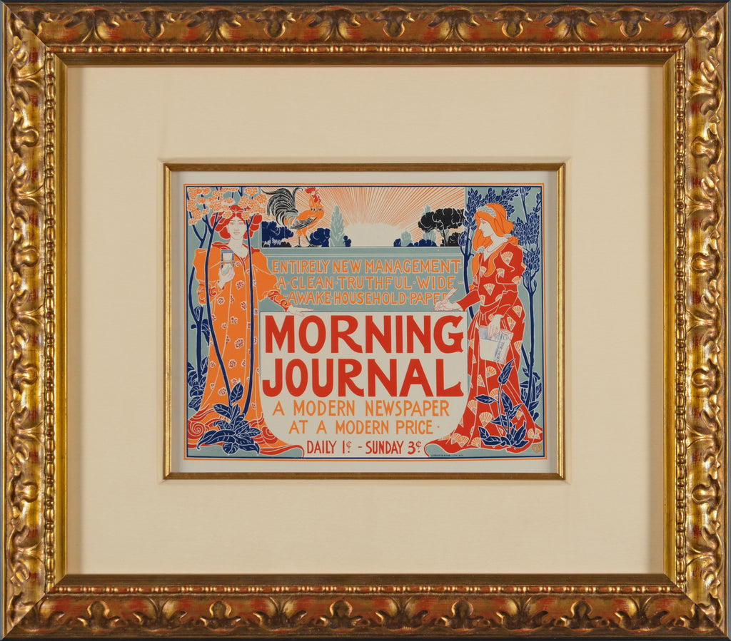 “Morning Journal (Plate 220)” was created by Louis Rhead who was an English born American artist, illustrator, author, and angler. In the early 1890s, Rhead became a prominent poster artist and was heavily influenced by the work of Swiss artist Eugene Grasset. During the poster craze of the early 1890s, Rhead’s poster art appeared regularly in Harper’s Bazaar. “Morning Journal (Plate 220)” is a 9 x 11.75 – inch original stone lithograph. Created in 1900.