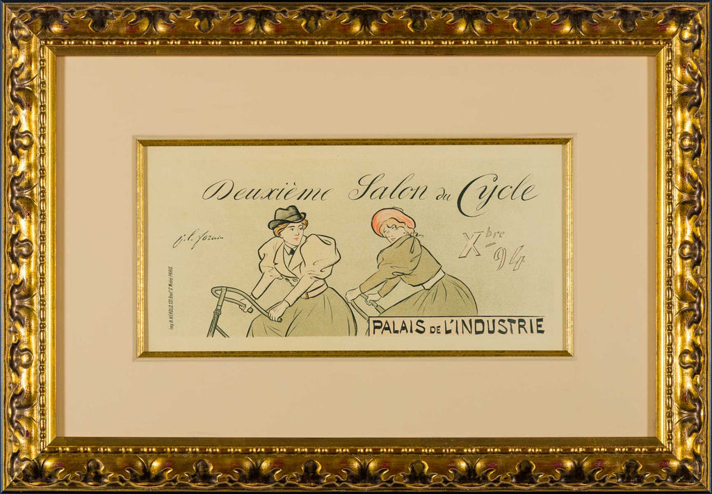 “Second Bicycle Show" (Plate 51) is an original lithograph in colors created by Jean-Louis Forain in 1896 for the Les Maîtres de l'Affiche. The image size: 15 x 7.25- inches. Paper size is 15.75 x 11.25 -inches. The artwork is framed with the latest archival framing techniques, and it is accompanied by a certificate of authenticity.