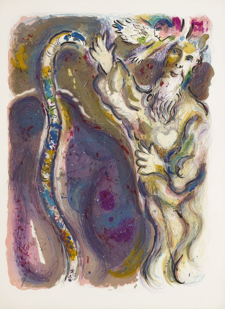 "He cast the rodde on the ground… (M.448)" from Marc Chagall's "The Story of Exodus," 1966. This is a color lithograph on Arches from the edition of 285 (250 on Arches, 20 on Japon and 15 HC on Arches). The framed artwork is 32 x 26" and the image size is 18 x 13". Framed in an ornate, gold-tone acanthus leaf frame, and shipped with a certificate of authenticity.