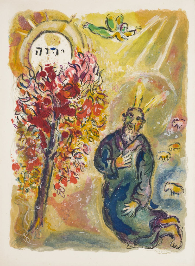 "Then the Angel of the Lorde appeared unto him in a flame of fire, out of the middes of a bush; and he looked, and beholde, the bush was not consumed. .(M.447)" from Marc Chagall's "The Story of Exodus," 1966. This is a color lithograph on Arches from the edition of 285 (250 on Arches, 20 on Japon and 15 HC on Arches). The framed artwork is 32 x 26" and the image size is 18 x 13". Framed in an ornate, gold-tone acanthus leaf frame, and shipped with a certificate of authenticity.