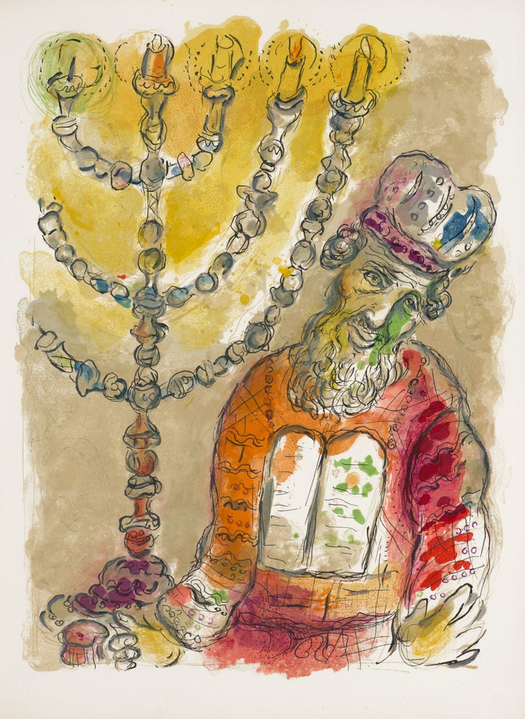 "Thou shalt also anoint Aaron and his sonnes, and shalt consecrate them, that they may minister unto me in the Priests offices. (M.458)" from Marc Chagall's "The Story of Exodus," 1966. This is a color lithograph on Arches from the edition of 285 (250 on Arches, 20 on Japon and 15 HC on Arches). The framed artwork is 32 x 26" and the image size is 18 x 13". Framed in an ornate, gold-tone acanthus leaf frame, and shipped with a certificate of authenticity.