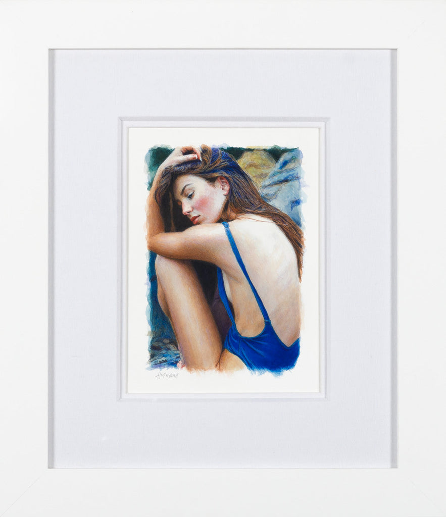 "Blue Bather" is a mixed media on paper painting created by Douglas Hofmann in 2021. The painting is signed 'HOFMANN' lower left. The image size is 9 x 6.25" and the artwork is framed in a contemporary white frame. The artwork ships framed.