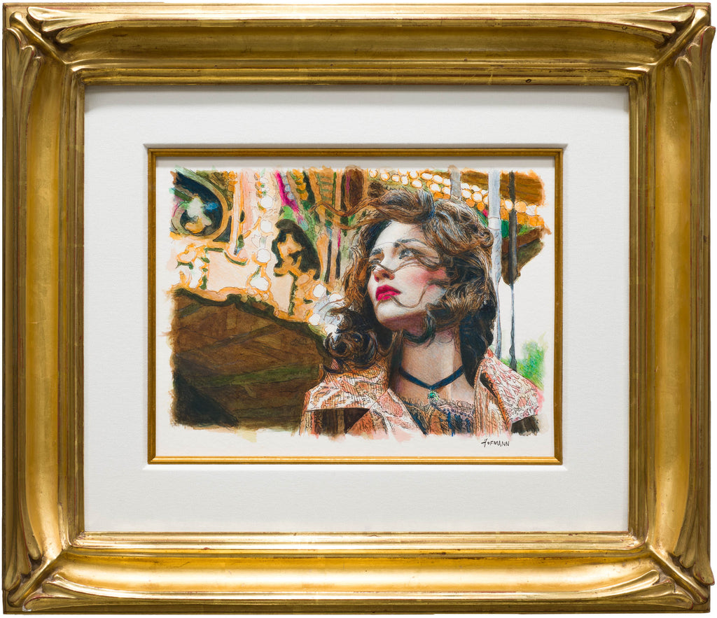 "Carousel" is a mixed media on paper painting created by Douglas Hofmann in 2024. The artwork is signed 'HOFMANN' lower right. The image size is 9 x 12" and the artwork is framed in a custom, closed-corner, ornate, gold leaf frame. The artwork ships framed.