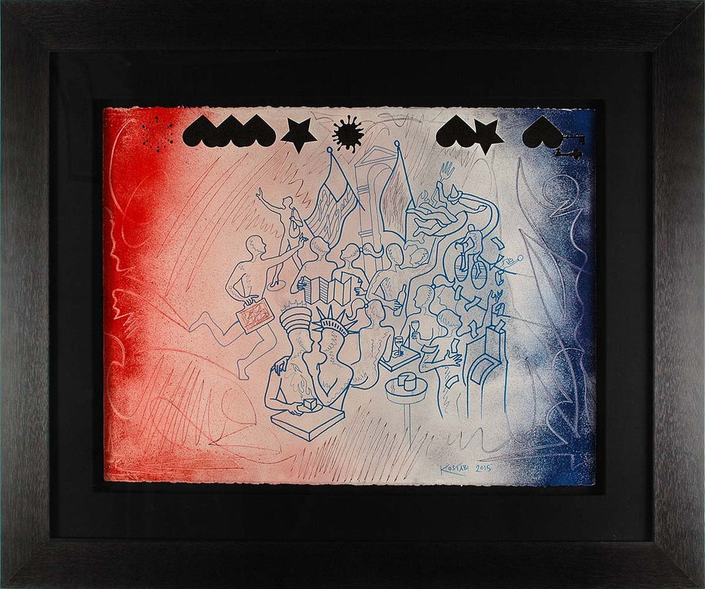 "New Glory" is a mixed media on paper drawing created by Mark Kostabi in 2015. The artwork is signed and dated 'KOSTABI 2015' lower right. The image size is 30 x 22.5" and the artwork is framed in a contemporary black frame. The artwork ships framed.