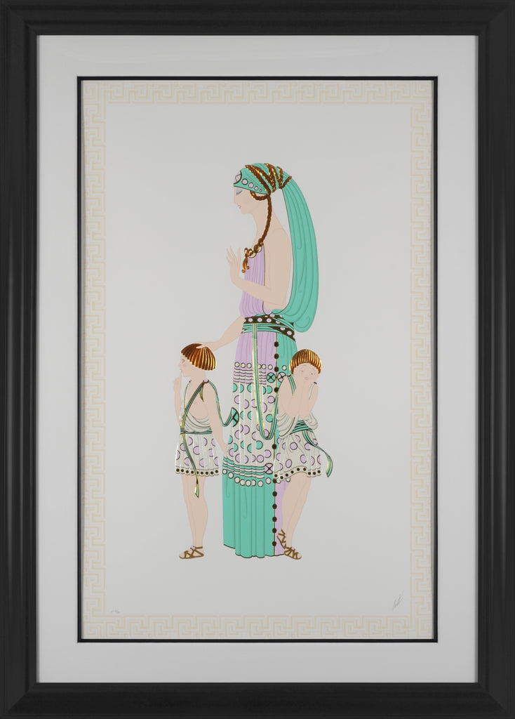 "Motherhood" is a serigraph created by Erté in 1989. From the edition of 676, the artwork is signed 'Erté' lower right. The image size is 38 x 23.5" and the artwork is framed in a contemporary, black frame. The artwork ships framed and accompanied by a certificate of authenticity.