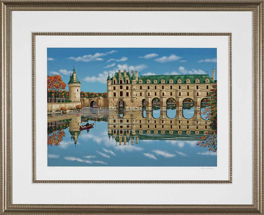 "Chenonceau (Chateaux)" is a serigraph on paper created by Liudmila Kondakova in 1996 for her 'Chateaux Suite'. From the edition of 425 on Coventry white paper, the edition also included 100 on Japon paper, for a total edition size of 525. The artwork is signed 'Kondakova' lower right and annotated lower left. The image size is 16 x 23" and the artwork is framed in a classic gold-tone frame. The artwork ships framed and accompanied by a certificate of authenticity.