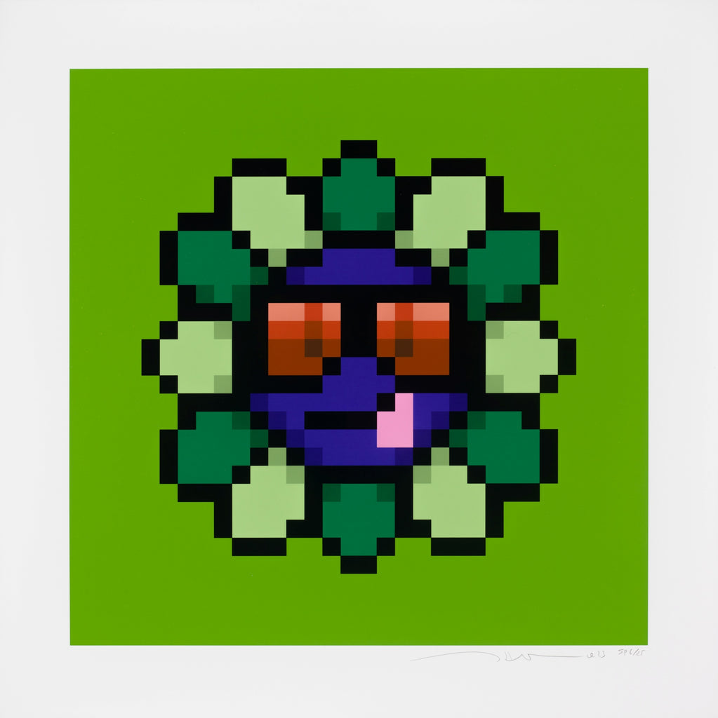 "Murakami.Flower #10397 Brown Sunglasses" is an archival pigment print and screenprint created by Takashi Murakami in 2023 for his 'Murakami.Flowers' series. From the edition of 126, the artwork is signed, dated and annotated lower right. The image size is 15.75 x 15.75" and the artwork is framed in a contemporary white frame. The artwork ships framed and accompanied by a certificate of authenticity.