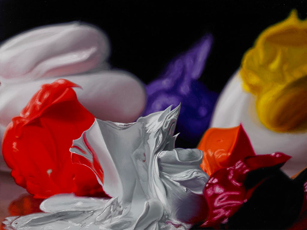 "Untitled (paint) #5" is an oil on linen painting created by Ben Weiner in 2018. The artwork is signed, titled and dated on verso, 'Ben Weiner Untitled (paint) #5 2018'. The canvas size is 18 x 24" and the artwork is framed in a contemporary white frame. The artwork ships framed.