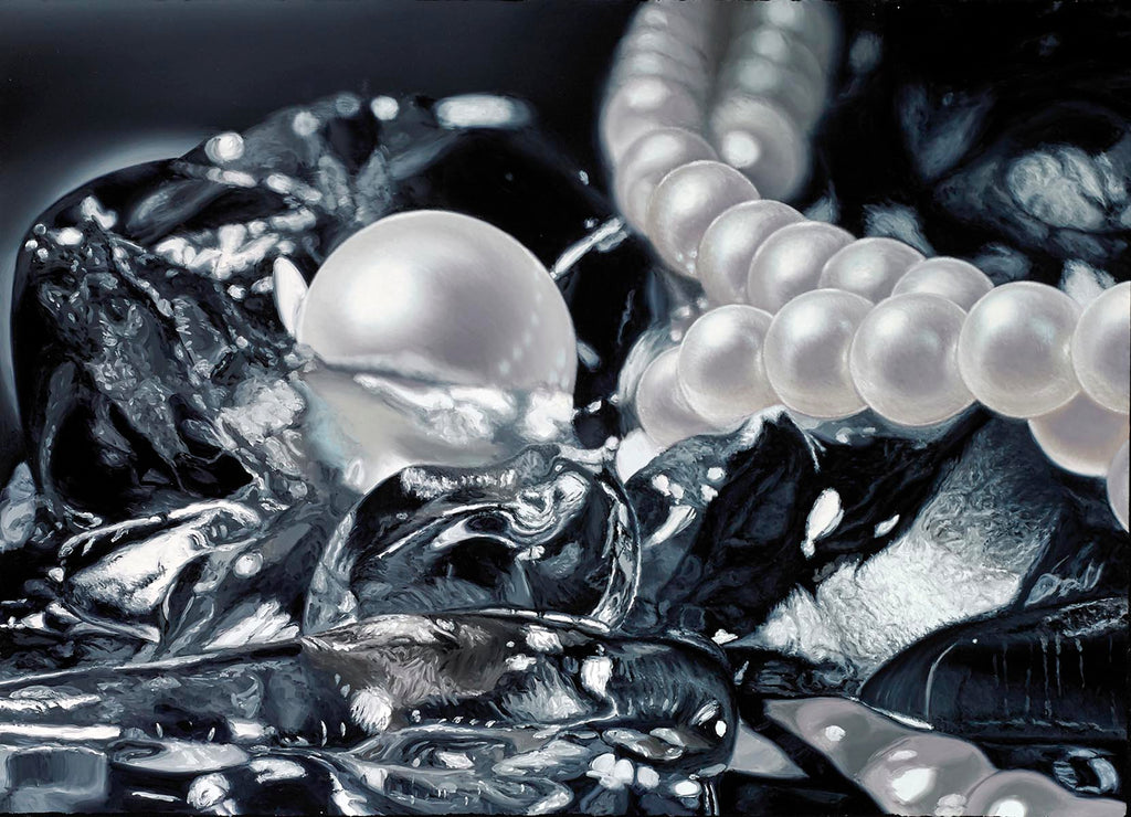 "Reflection Pearls II" is an oil on prepared paper painting created by Ben Weiner in 2019. The artwork is signed, titled and dated on verso, 'Ben Weiner Reflection Pearls II 2019'. The image size is 29.75 x 41.25" and the artwork is framed in a contemporary white frame. The artwork ships framed.
