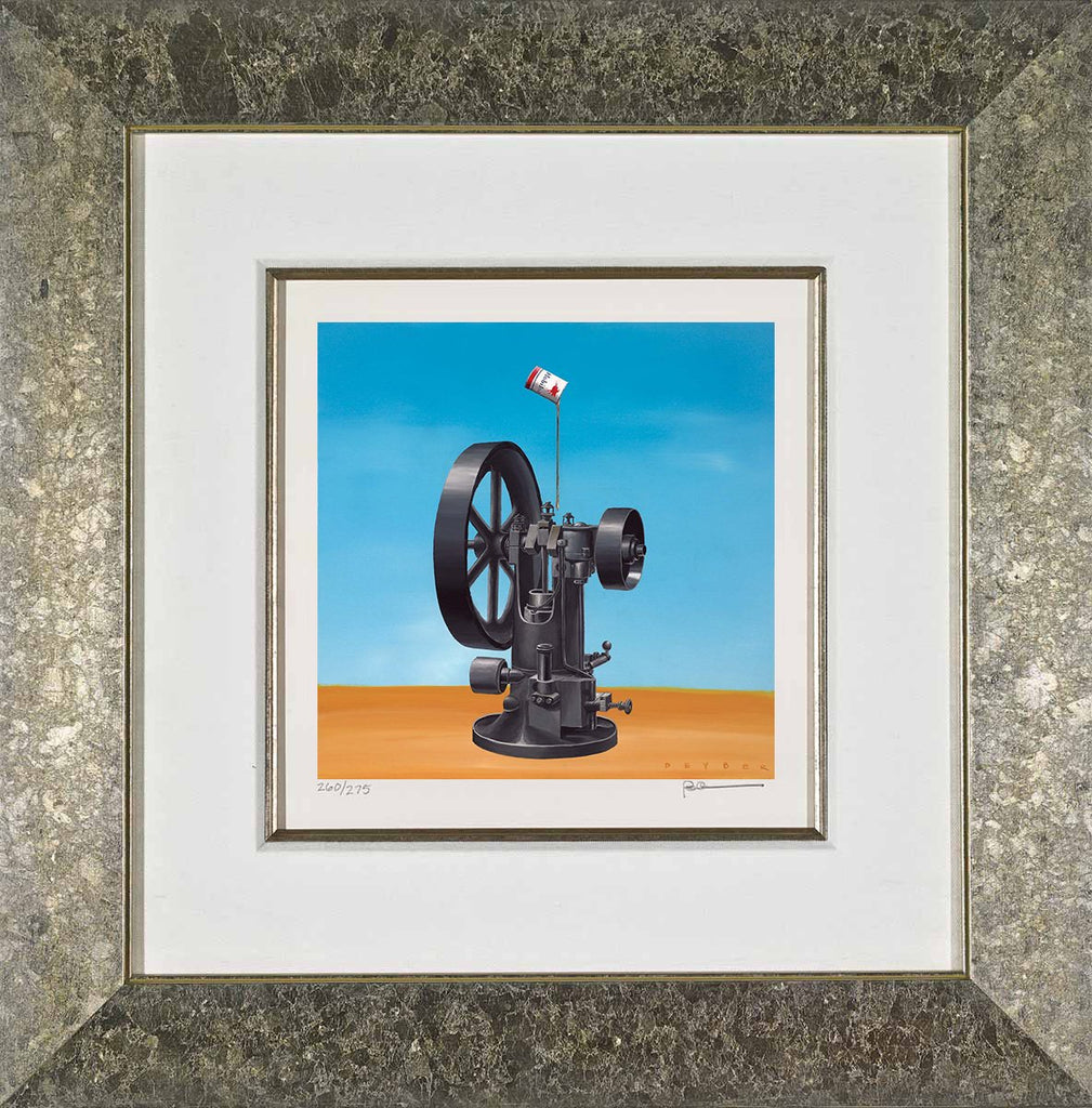 "The Well Oiled Machine" is a 9.5 x 9 -inch Robert Deyber Lithograph. "The Well Oiled Machine" comes framed, signed and with a certificate of authenticity.