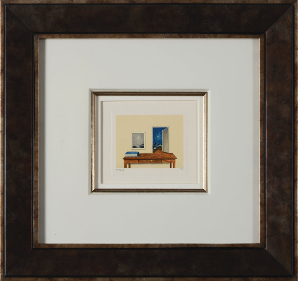 Each of Brennan's prints is a compact world of real and imaginary elements, playful and ambiguous, though completely enjoyable. "My intention is to depart entirely from the the customary view of miniature painting," notes the artist. "I do not paint mementos. Rather, by placing familiar objects in unfamiliar settings, I try to produce an image that will be remembered for its own sake."