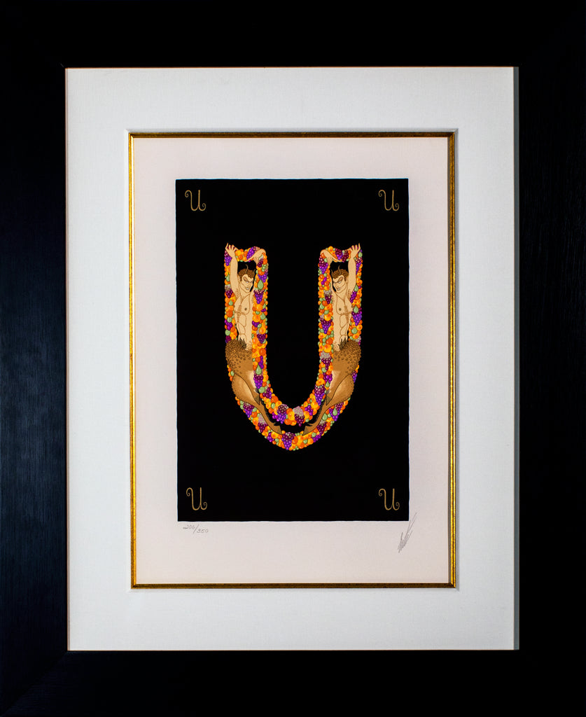"Letter U" is a lithograph and serigraph created by Erté for his 1976 'Alphabet' suite. From the edition of 491, and the artwork is signed 'Erté' lower right. The image size 15.75 x 10.5" and the artwork is framed in a contemporary black frame. The artwork ships framed and accompanied by a certificate of authenticity.