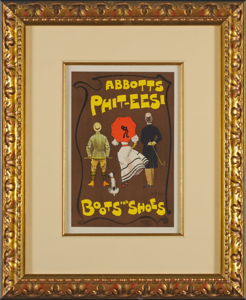 “Boots and Shoes (Plate 97)” was created by Dudley Hardy who was the eldest son of the marine painter Thomas Bush Hardy under whose influence and tutelage he first learned to draw and paint. His interest in illustration led to the production of French graphic influenced poster imagery, most notably “The Yellow Girl” advertisement for Today magazine, and “Gaiety Girls.” “Dudley Hardy” was a prolific artist who really introduced the color poster to England. “Boots and Shoes (Plate 97)” is a 13 x 9 –inch original stone lithograph created in 1897.