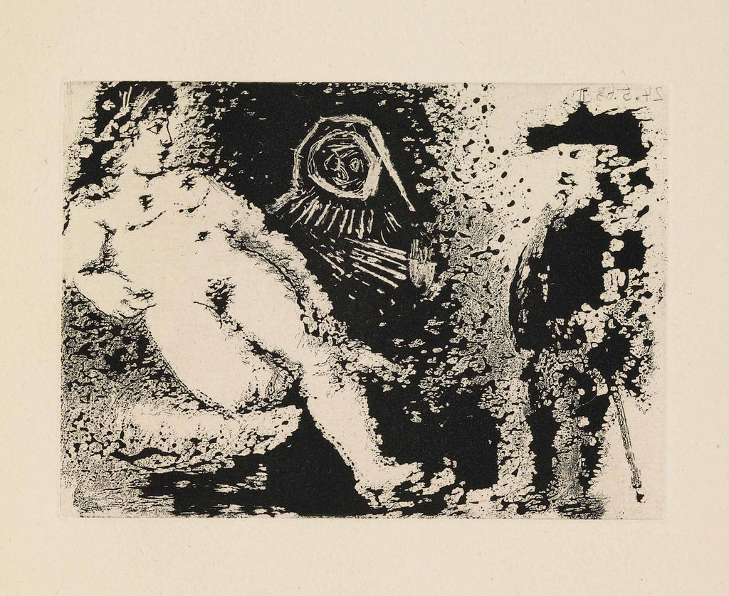 "Célestine with Young Woman and Client (B.1588)" is an aquatint created by Pablo Picasso in 1968 for his series 'La Célestine'. From the edition of 400, the image size is 4 x 5". The artwork ships framed and accompanied by a certificate of authenticity.