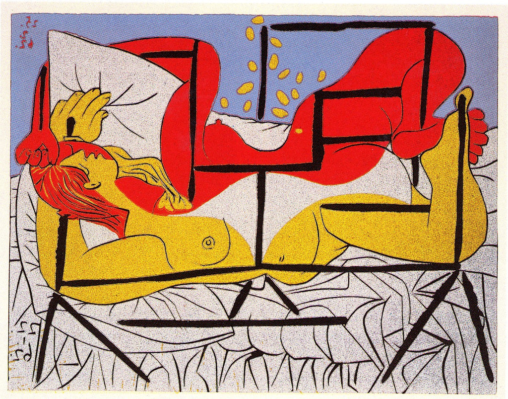 "Danaé (B.1084)" is a linocut created by Pablo Picasso in 1962. From the edition of 70, the artwork is signed 'Picasso' lower right and annotated lower left. The image size is 10.5 x 13.5" and the artwork is framed in a custom, ornate gold-tone frame. The artwork ships framed and accompanied by a certificate of authenticity.