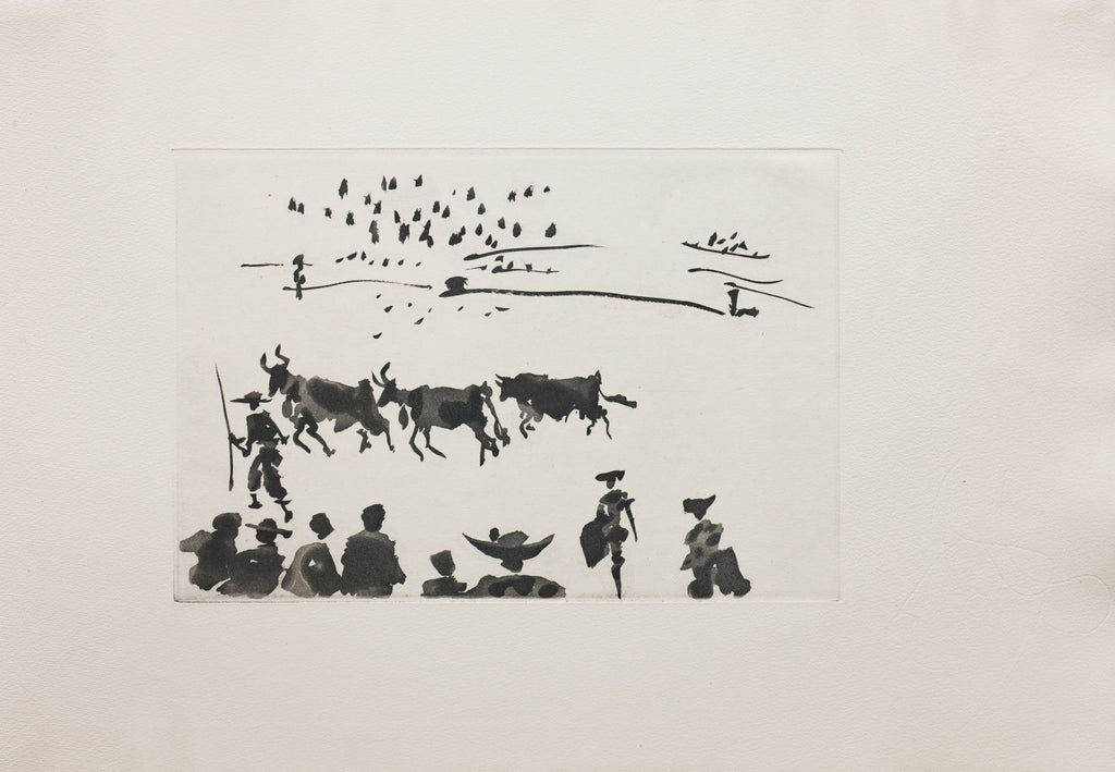 "Los Cabestros Retiran al Toro Manso (B.959)" is an aquatint, from the edition of 263, created by Pablo Piacsso for his "La Tauromaquia" series in 1959. The image size is 7.87 x 11.5" and the artwork is framed in a contemporary black frame. The artwork ships framed and is accompanied by a certificate of authenticity.