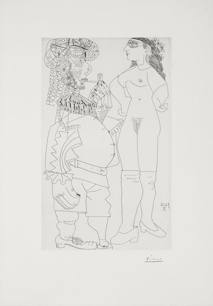In printmaking, the 347 Series was the undertaking which defined late Picasso. This prodigious outpouring of work, dating from March 16th–October 5th, 1968, deals with all of his old themes and fantasies, adding an obsession newly central in the late sixties, the artist as voyeur. It is in this role, rather than that of a protagonist, that the artist figures in these fantastic narration's. The series has been described as taking the form of a stream-of-consciousness epic. There is a suggestion of narratives throughout the series; however, there is never a point where a story comes to completion or where suggested desire is realized. There are faces we know, tales we have seen, and the work of great masters is recognizably revisited, but all without a clear endpoint. These prints become instead a stroll through the mind and memories at the end of Picasso’s much-lived life. A note about the technical production of these plates - to work with full freedom and concentration, Picasso had his printers, the brothers Crommelynck, bring the etching plates and hand press to his farmhouse near Cannes.