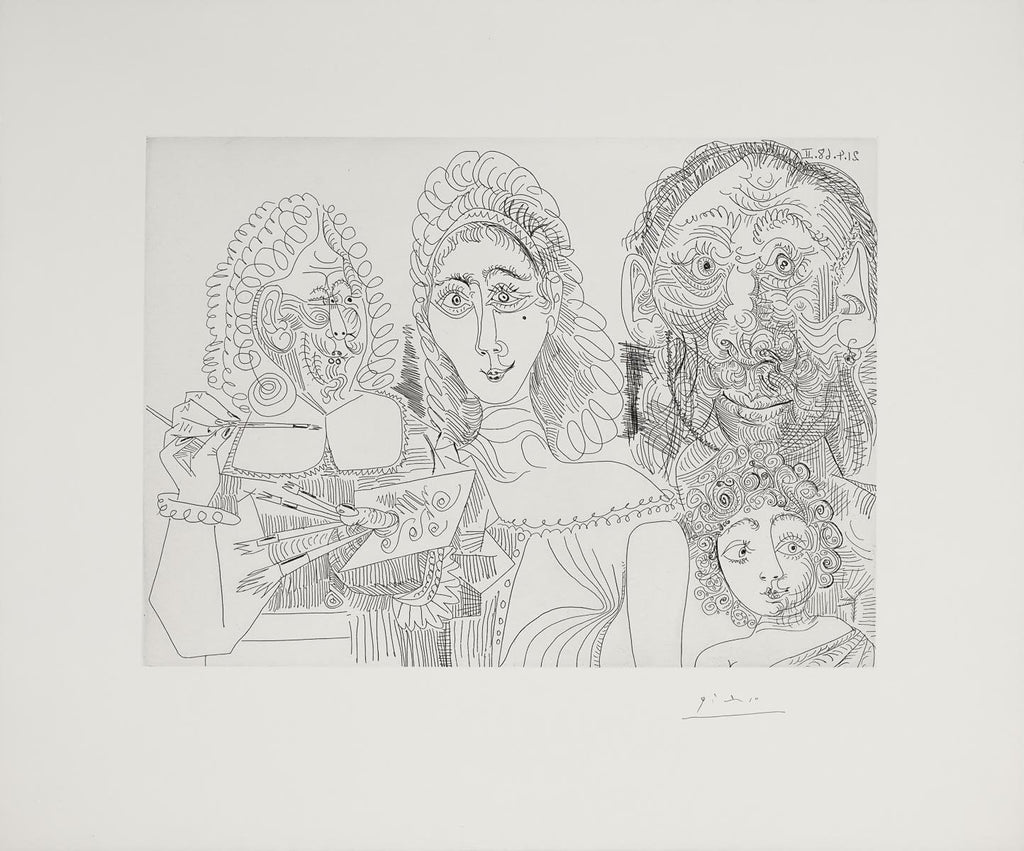 In printmaking, the 347 Series was the undertaking which defined late Picasso. This prodigious outpouring of work, dating from March 16th–October 5th, 1968, deals with all of his old themes and fantasies, adding an obsession newly central in the late sixties, the artist as voyeur. It is in this role, rather than that of a protagonist, that the artist figures in these fantastic narration's. The series has been described as taking the form of a stream-of-consciousness epic. There is a suggestion of narratives throughout the series; however, there is never a point where a story comes to completion or where suggested desire is realized. There are faces we know, tales we have seen, and the work of great masters is recognizably revisited, but all without a clear endpoint. These prints become instead a stroll through the mind and memories at the end of Picasso’s much-lived life. A note about the technical production of these plates - to work with full freedom and concentration, Picasso had his printers, the brothers Crommelynck, bring the etching plates and hand press to his farmhouse near Cannes.