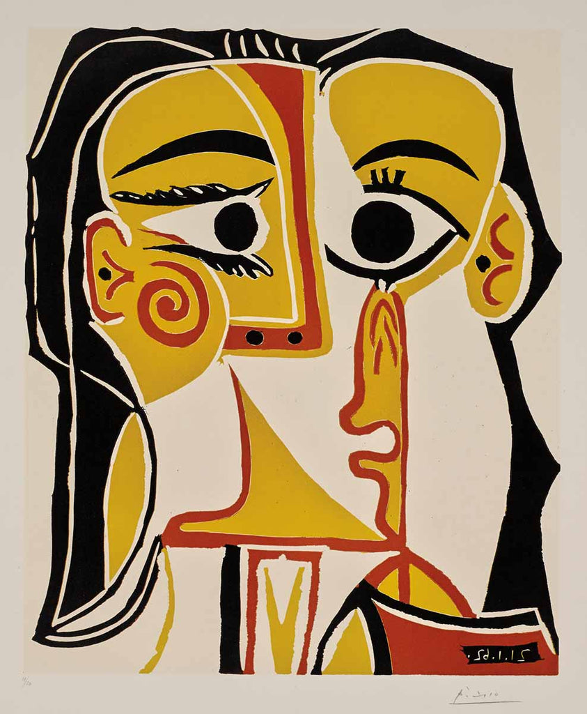 Picasso was a master in the art of all media, but nothing is more distinctive to his identity than the print making process known as linocut. This is a relief media, akin to woodcut, but using linoleum. Normally, in multi-color works, multiple plates are used, one for each color. However, Picasso was an endless innovator. He came up with a way to generate overlaid colors from a single cutaway plate. The first imprint was solid, usually comprising the background. Each successive series of cutaway’s produced more of a void, so the prior layer could show through. Each new visit to the plate yielded the possibility of another color. No one had thought of anything like this before him. Picasso’s final muse, and second wife, Jacqueline, became the iconic emblem of Picasso’s concept of feminine beauty. Her long black hair, one her most memorable features, is the topic here in one of his most characteristic portraits.