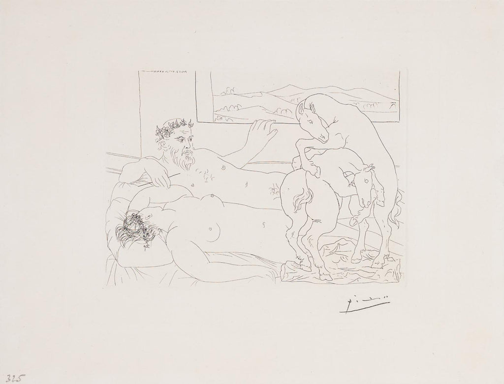 "Reclining Sculptor and Model By a Window… (B.173)" is an etching created by Pablo Picasso in 1939 for his renowned 'Vollard Suite'. From the edition of 303, the artwork is signed 'Picasso' lower right. The image size is 8 x 11" and the artwork is framed in a custom, Spanish-style, closed-corner, black and gold frame. The artwork ships framed and is accompanied by a certificate of authenticity.