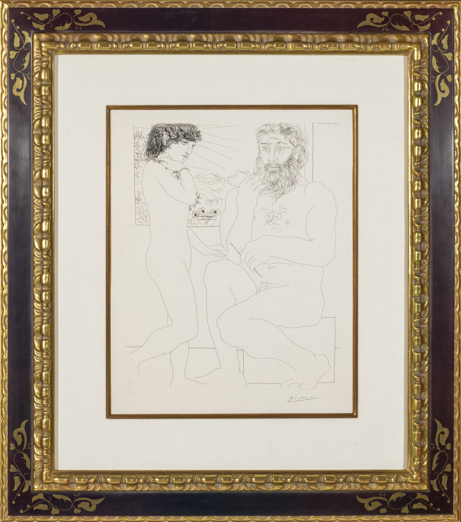 "Sculptor and Model by a Window (B.177)" is an etching created by Pablo Picasso in 1939 for his renowned 'Vollard Suite'. From the edition of 303, the artwork is signed 'Picasso' lower right. The image size is 15 x 12" and the artwork is framed in a custom, Spanish-style, closed-corner, black and gold frame. The artwork ships framed and is accompanied by a certificate of authenticity.