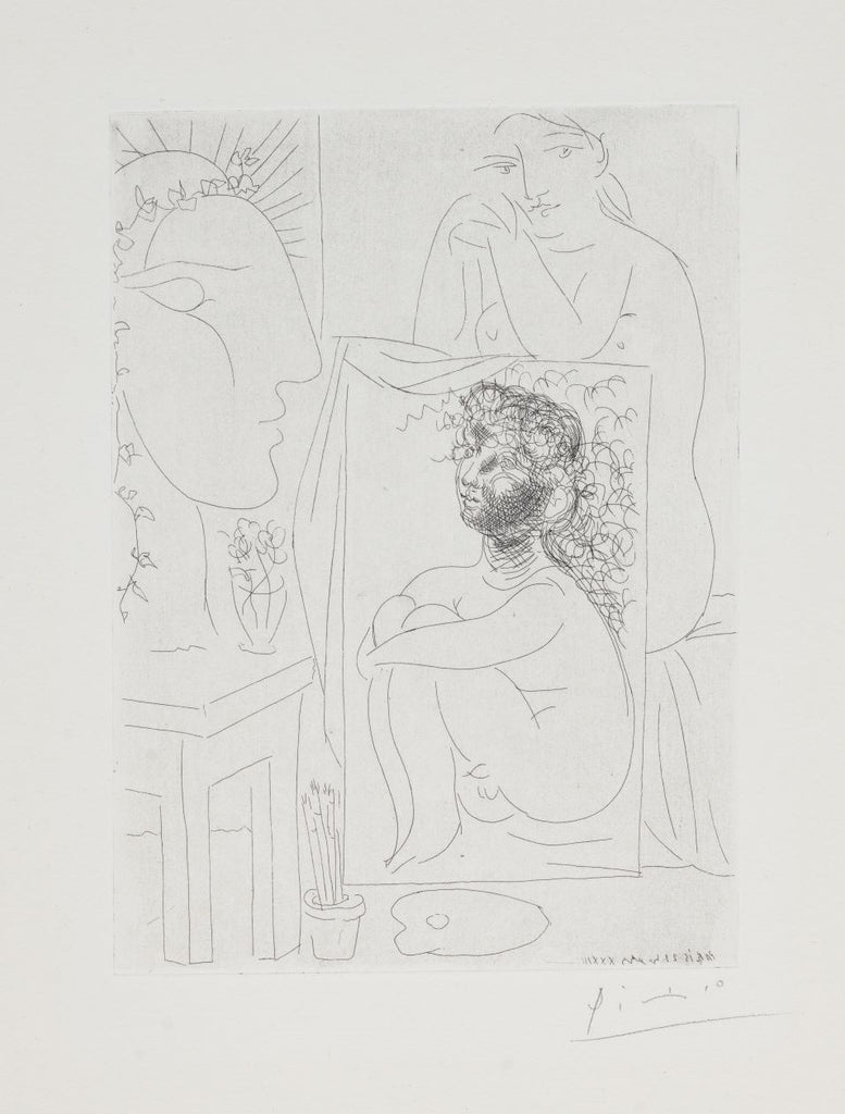 "Seated Nude with Painting and Sculptured Head (B.151)" is an etching on Montval created by Pablo Picasso for his 'Vollard Suite' in 1933. From the edition of 303, the artwork is hand-signed 'Picasso' lower right. The image size is 11 x 8" and the artwork is framed in a custom Spanish-style, closed-corner, black and gold frame. The artwork ships framed and is accompanied by a certificate of authenticity.