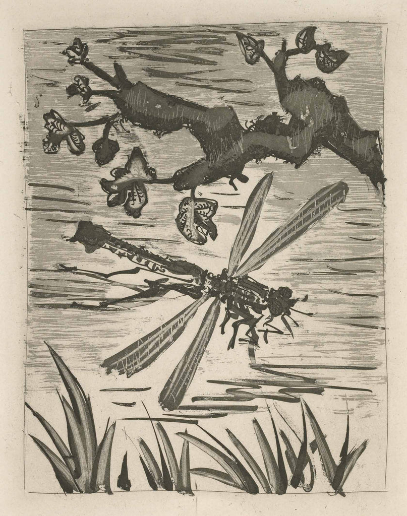 "The Dragonfly (B.354)" is an aquatint created by Pablo Picasso in 1942 for his series 'Histoire Naturelle - Textes de Buffon'. From the edition of 262, the image size is 10.75 x 8.5". The artwork is framed in a contemporary black frame. The artwork ships framed and accompanied by a certificate of authenticity.