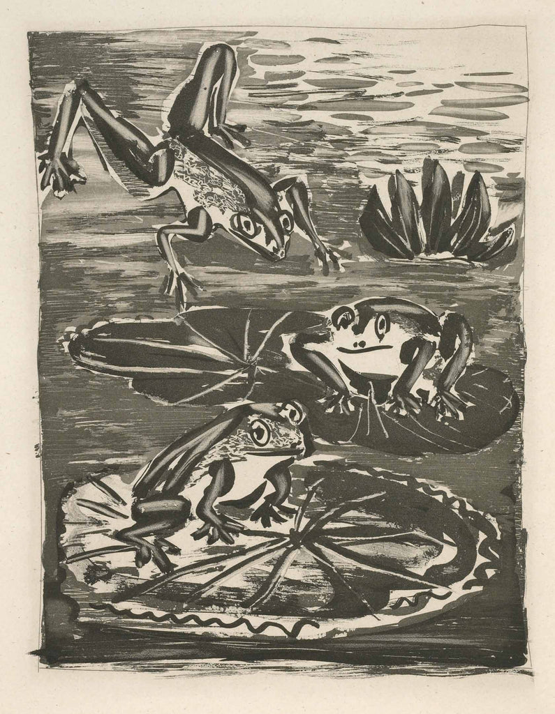 "The Frog (B.357)" is an aquatint created by Pablo Picasso in 1942 for his series 'Histoire Naturelle - Textes de Buffon'. From the edition of 262, the image size is 10.5 x 7.75". The artwork is framed in a contemporary black frame. The artwork ships framed and accompanied by a certificate of authenticity.