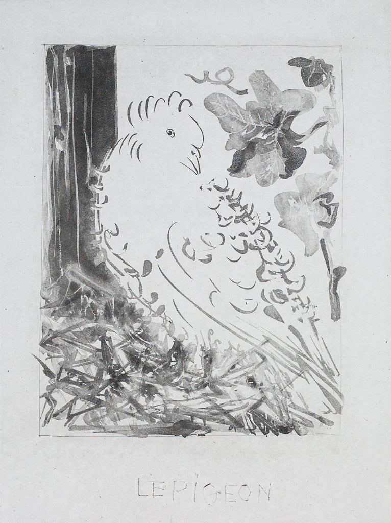 "The Pigeon (B.347)" is an aquatint with drypoint on chine created by Pablo Picasso in 1942 for his series 'Histoire Naturelle - Textes de Buffon'. The artwork is from the edition of 262, with remarque. The image size is 10.5 x 8" and the artwork is framed in a contemporary silver and gray frame. The artwork ships framed and accompanied by a certificate of authenticity.
