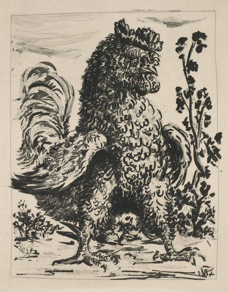 "The Rooster (B.344)" is an aquatint created by Pablo Picasso in 1942 for his series 'Histoire Naturelle - Textes de Buffon'. From the edition of 262, the image size is 10.75 x 8.5". The artwork is framed in a contemporary black frame. The artwork ships framed and accompanied by a certificate of authenticity.