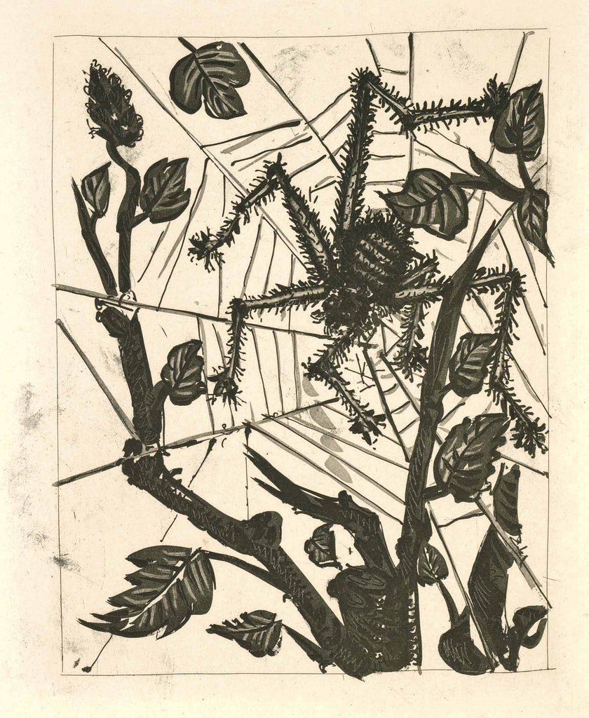 "The Spider (B.353)" is an aquatint created by Pablo Picasso in 1942 for his series 'Histoire Naturelle - Textes de Buffon'. From the edition of 262, the image size is 10.75 x 8.5". The artwork is framed in a contemporary black frame. The artwork ships framed and accompanied by a certificate of authenticity.