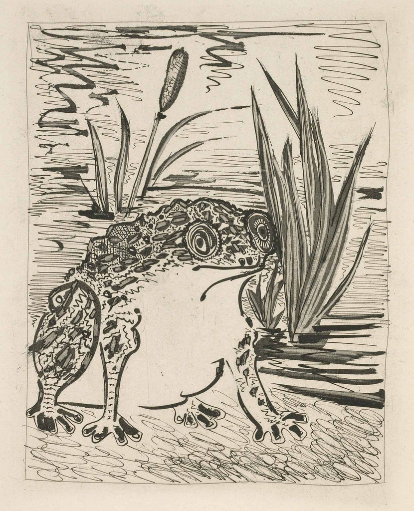"The Toad (Histoire Naturelle - Textes de Buffon, B.356)" is an aquatint with drypoit created by Pablo Picasso. The image size is 14.25" x 11". The artwork ships framed and with a certificate of authenticity.