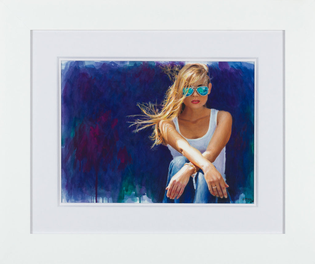 "Cool Reflections" is a watercolor and pastel on paper painting created by Douglas Hofmann in 2020. The painting is signed 'HOFMANN' lower right. The image size is 20 x 15" and the artwork is framed in a contemporary white frame. The artwork ships framed.