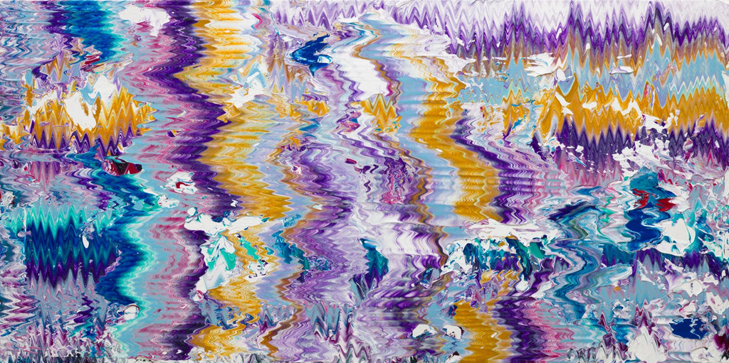 "Currents" is an acrylic on canvas painting created by Robert Standish in 2024. The artwork is signed, titled and dated on verso. The canvas size is 24 x 48" and the artwork is framed in a contemporary white frame. The artwork ships framed.