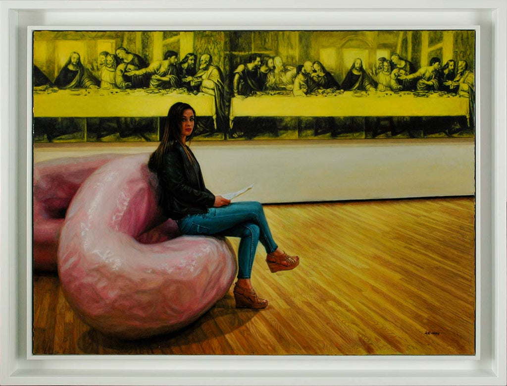 "The Last Supper" is an oil on panel painting created by Douglas Hofmann in 2015. The artwork is signed 'HOFMANN' lower right. The image size is 30 x 41" and the artwork is framed in a contemporary white frame. The artwork ships framed.