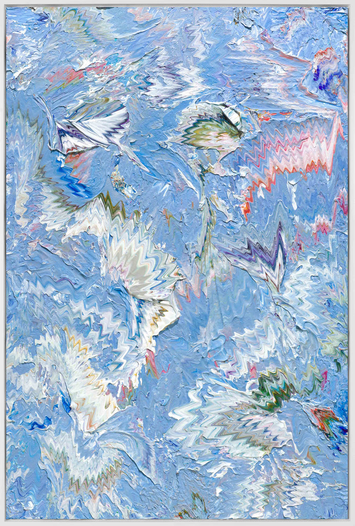 "In the Blue Wind" is an acrylic on canvas painting created by Robert Standish in 2023. The painting is signed, titled and dated on verso. The canvas size is 36 x 24" and the artwork is framed in a contemporary white frame. The artwork ships framed.