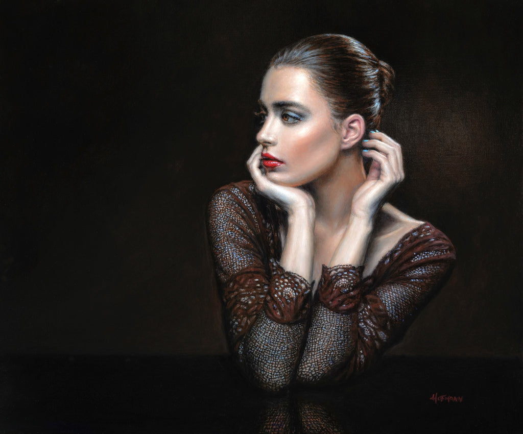 "Lady in Lace" is an oil on panel painting created by Douglas Hofmann in 2024. The artwork is signed 'HOFMANN' lower right. The image size is 16 x 19" and the artwork is framed in a closed-corner, black and gold frame. The artwork ships framed.